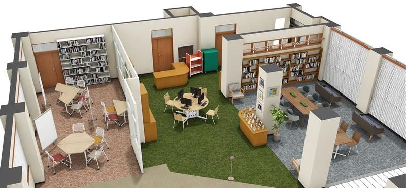 コモンズとは、さまざまな人が集い・共有する空間です。今までカウンターや事務室だったスペースを利用者の方が使えるコモンズとしてレイアウト変更します。